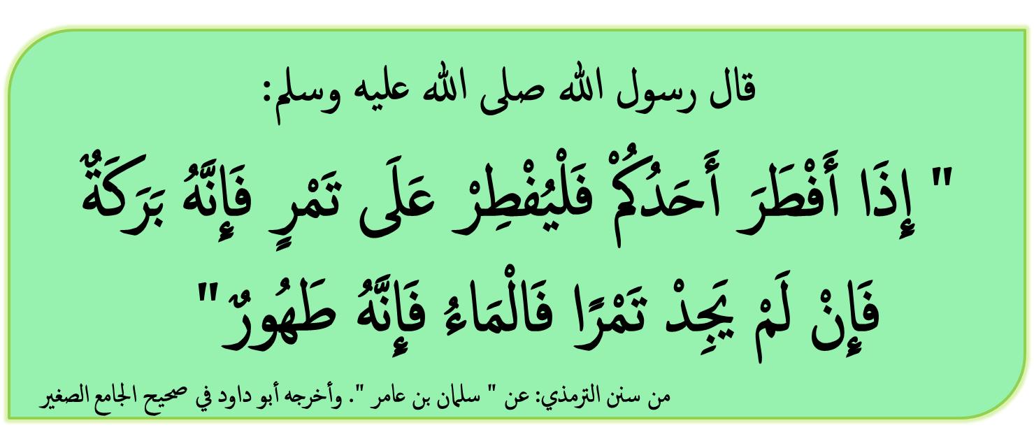 جرت العادة عند كل المسلمين على الإفطار على التمر في رمضان و هذا إقتداءً بسُنّة الحبيب المصطفى في قوله ( إِذَا أَفْطَرَ أَحَدُكُمْ فَلْيُفْطِرْ عَلَى تَمْرٍ فَإِنَّهُ بَرَكَةٌ فَإِنْ لَمْ يَجِدْ تَمْرًا فَالْمَاءُ فَإِنَّهُ طَهُورٌ)من سنن الترمذي: عن ” سلمان بن عامر “. وأخرجه أبو داود في صحيح الجامع الصغير.